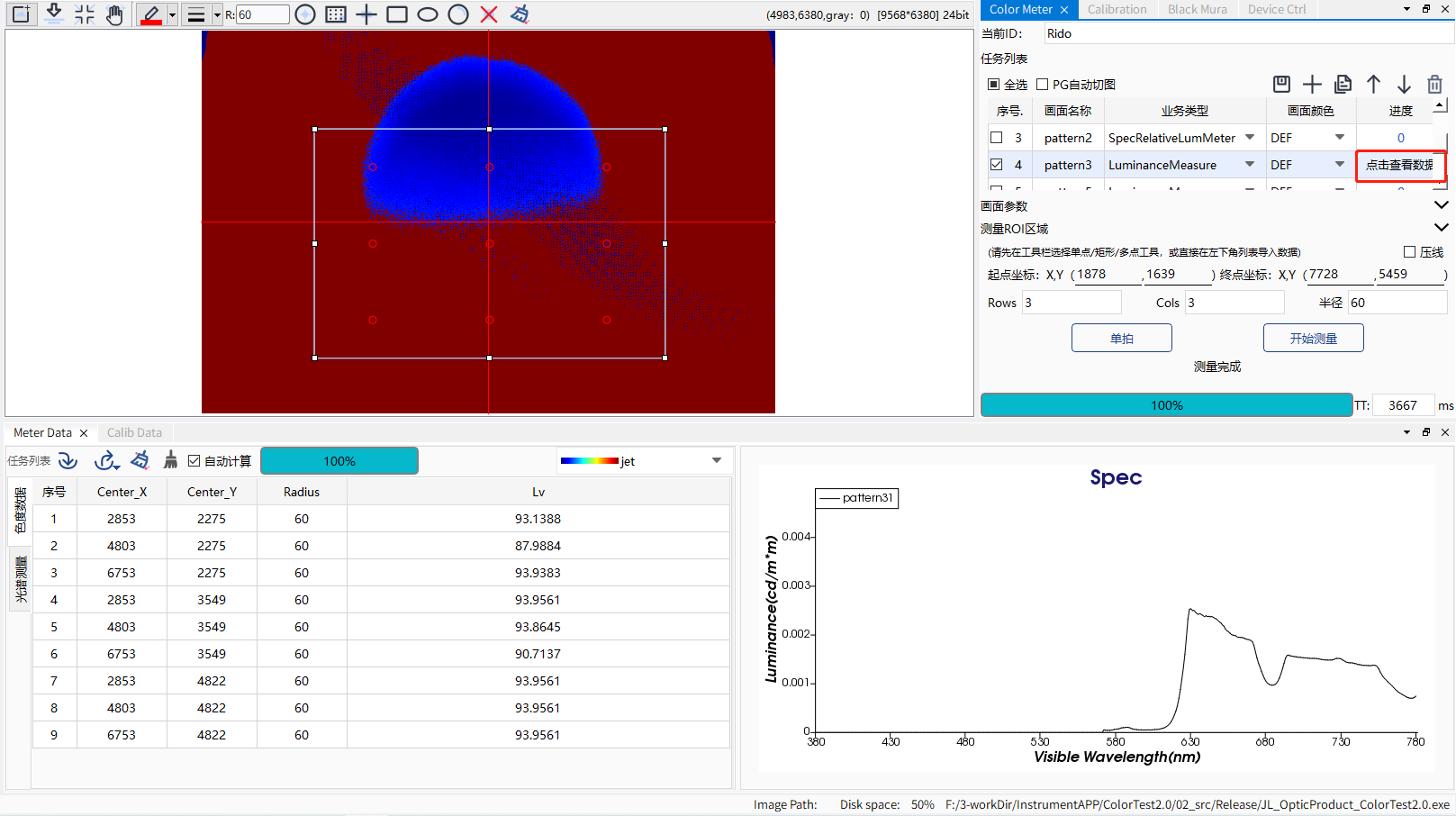 LCD、OLED、Mini-LED和Micro-LED 中心區域光譜測量及成像式子子圖元級高精度亮度測量,支援顯示幕AOI、Mura補償、Gamma、Flicker多功能一體調測