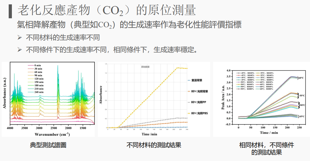 傳統的方法之所以需要數百小時,是因為它是去量測老化「結果」的變化,例如失光率、色差或力學性能的衰減。這些物理性質的變化需要累積到一定程度才能被準確量測,因此需要很長的時間。而新方法則是專注於量測老化的化學「過程」,即老化的反應速率。利用CO2濃度的變化(d[CO2]/dt),來表徵PBAT老化化學反應的速率(k)。